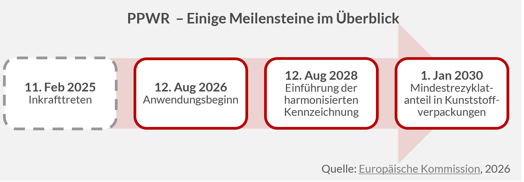 Umweltorganisationen hingegen betonen die Notwendigkeit einer zentralen Organisation, etwa für eine zentrale Koordination der Etablierung von Mehrwegsystemen. Wirtschaftsverbände kritisieren den unveränderten Paragrafen zur Ökomodulierung zudem als verpasste Chance, Anreize für recyclingfähige Verpackungen zu schaffen. Gleichzeitig werden aus einzelnen Branchen Forderungen nach allgemeinen Ausnahmen von der PPWR laut. Die PPWR findet im August dieses Jahres Anwendung.