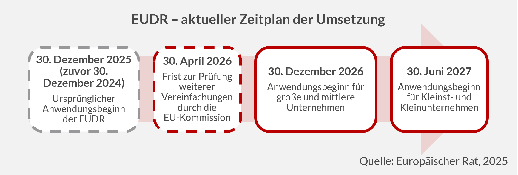 Das EU-Parlament hat Änderungen an der EUDR verabschiedet und damit eine bereits informell mit den Mitgliedstaaten erzielte Einigung bestätigt. Die formelle Zustimmung des Rates steht noch aus. Geplant sind unter anderem ein um zwölf Monate verschobener Anwendungsbeginn sowie vereinfachte Sorgfaltspflichten, insbesondere für kleine und kleinst-Primärerzeuger sowie für nachgelagerte Marktteilnehmer. Der Anwendungsbeginn ist für große Unternehmen ab Ende 2026 und für kleine Unternehmen ab Mitte 2027 vorgesehen. Bis zum 30. April 2026 soll die EU-Kommission die Auswirkungen der Verordnung und mögliche weitere Vereinfachungen prüfen.